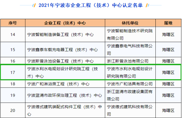 近日,寧波市發(fā)展和改革委員會、寧波市經(jīng)濟(jì)和信息化局、寧波市財政局、寧波市科學(xué)技術(shù)局聯(lián)合發(fā)文,公布2021年寧波市企業(yè)工程(技術(shù))中心認(rèn)定名單。我院為主體申報的“寧波水利水電... -