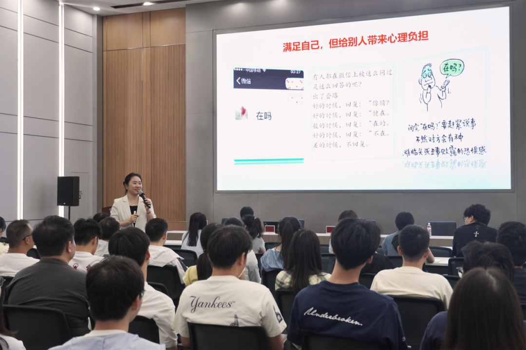 陳瑛老師的講座圍繞自我激勵、協(xié)同溝通、對外溝通、對上溝通四大維度展開。首先,陳瑛老師分別以工作場景和生活場景中的溝通對話與大家進行互動,帶領大家對“高情商”進行思考與剖析,由此展開當天的主題。隨后,結合豐富的實戰(zhàn)案例與互動環(huán)節(jié),陳瑛老師層層遞進,深入淺出地講解了如何在日常工作中實現(xiàn)高效溝通,激發(fā)自我驅動力,提升團隊協(xié)同效能。在長達2.5小時的課程中,陳瑛老師還結合商務禮儀的要點,根據(jù)不同場景對溝通實操進行了解析。并強調,良好的溝通不僅是技巧,更是一種心態(tài)與習慣的培養(yǎng),也是實現(xiàn)個人與團隊實現(xiàn)共同成長的重要途徑。