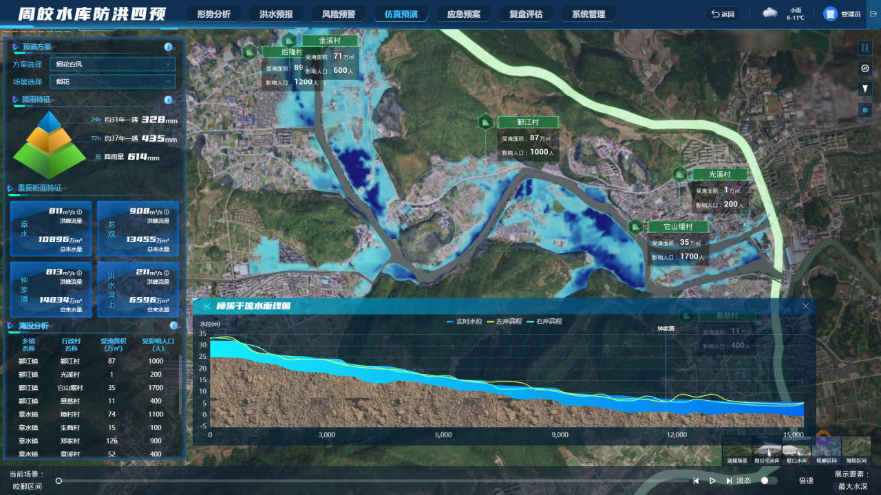 入庫1800多場歷史臺風(fēng)信息,通過臺風(fēng)路徑相似度匹配,獲取歷史臺風(fēng)周公宅水庫、皎口水庫庫區(qū)降雨網(wǎng)格化數(shù)據(jù),為預(yù)報和調(diào)度決策提供參考。建設(shè)鄞江流域產(chǎn)匯流模型、梯級水庫聯(lián)合調(diào)度模型和水庫下游一二維耦合水動力模型,通過水庫調(diào)度對下游防洪影響的正向預(yù)演,以及對上游庫區(qū)淹沒和大壩自身安全的逆向推演,動態(tài)推薦多目標(biāo)優(yōu)化調(diào)度方案,有力支撐水庫從前期預(yù)泄、中期錯峰到后期攔蓄的全過程調(diào)度決策。將傳統(tǒng)的各水庫獨(dú)立預(yù)報的流程進(jìn)行重塑,實(shí)現(xiàn)兩座水庫工作人員在同一平臺上協(xié)同操作、實(shí)時計(jì)算與快速分析,聯(lián)合預(yù)報調(diào)度方案的制定時間從原先的10分鐘縮減至目前的1—2分鐘,顯著提升了洪水預(yù)報效率。同時,周公宅水庫、皎口水庫高精度的洪水預(yù)報,為寧波市甬江流域一體化調(diào)度提供較為精確的上邊界條件,提高了下游平原河網(wǎng)的洪水預(yù)報精度,在近年的流域防洪中發(fā)揮了很好的實(shí)戰(zhàn)作用。