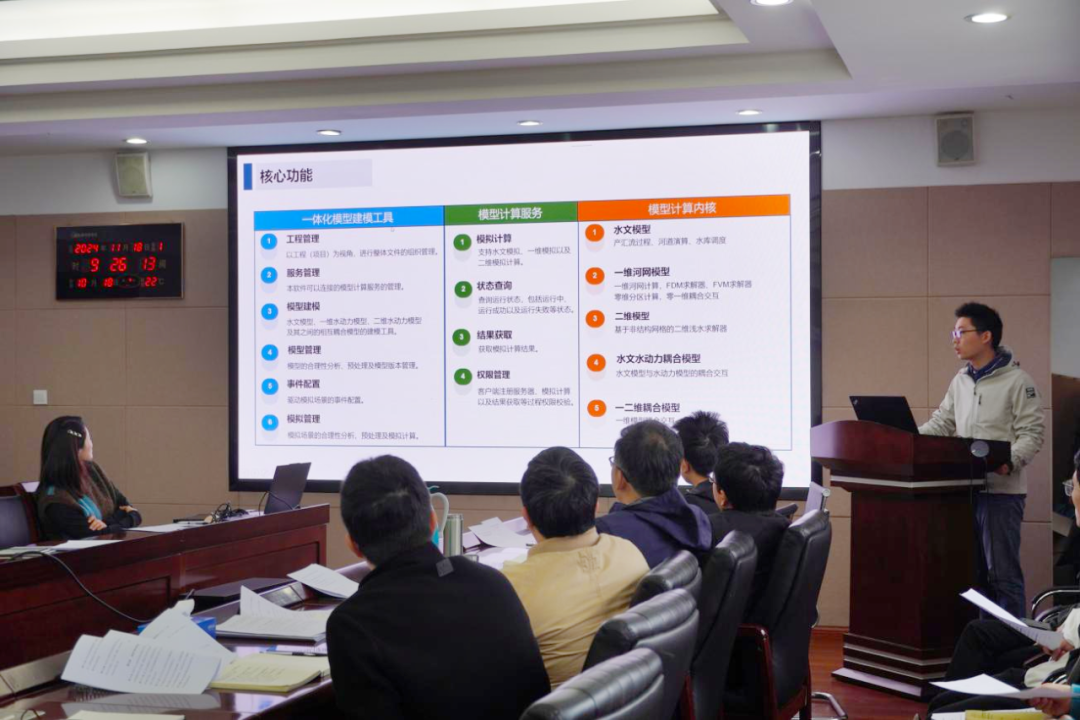 隨后,平臺研發(fā)團(tuán)隊(duì)代表陳龍贊對“澤圖水文水動(dòng)力一體化模型平臺”進(jìn)行詳細(xì)介紹,并進(jìn)行現(xiàn)場實(shí)操演示。該平臺是一套我院自主研發(fā)的以組件化建模、并行化求解、在線化計(jì)算、一體化耦合、國產(chǎn)化支持為核心的水文水動(dòng)力模型平臺,能夠滿足包括產(chǎn)匯流計(jì)算、水庫調(diào)度、一維河網(wǎng)、二維淹沒、水文水動(dòng)力耦合、一二維水動(dòng)力耦合在內(nèi)的多種模擬需求,適用于獨(dú)立部署、嵌入第三方項(xiàng)目等多種應(yīng)用場景。基于建模工具、模型服務(wù)、計(jì)算核心三分離的設(shè)計(jì)架構(gòu),平臺具備分布式部署、集群化管理、多節(jié)點(diǎn)負(fù)載均衡的動(dòng)態(tài)能力,滿足靈活適用多種尺度的計(jì)算需要。